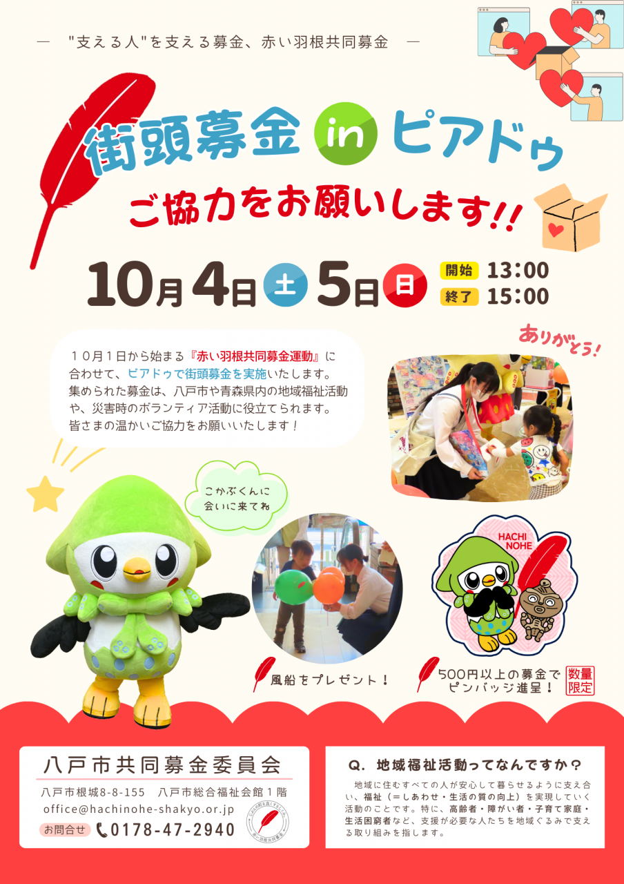 また、10月4日(土)、5日(日)は、ピアドゥ内にて、いかずきんズのこかぶくんと一緒に街頭募金を実施いたします。
